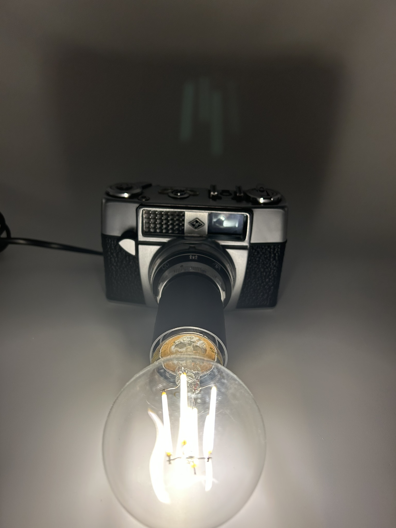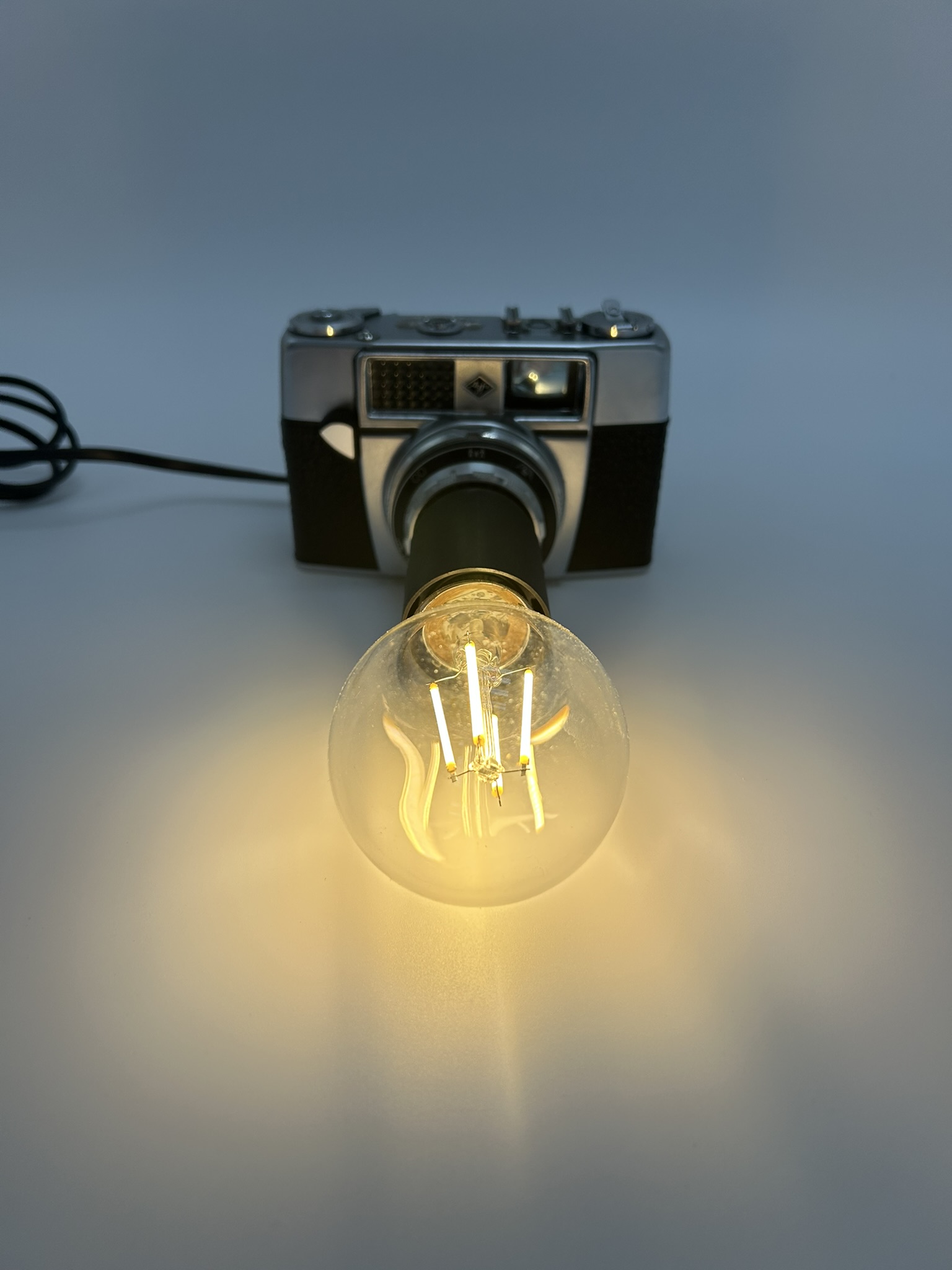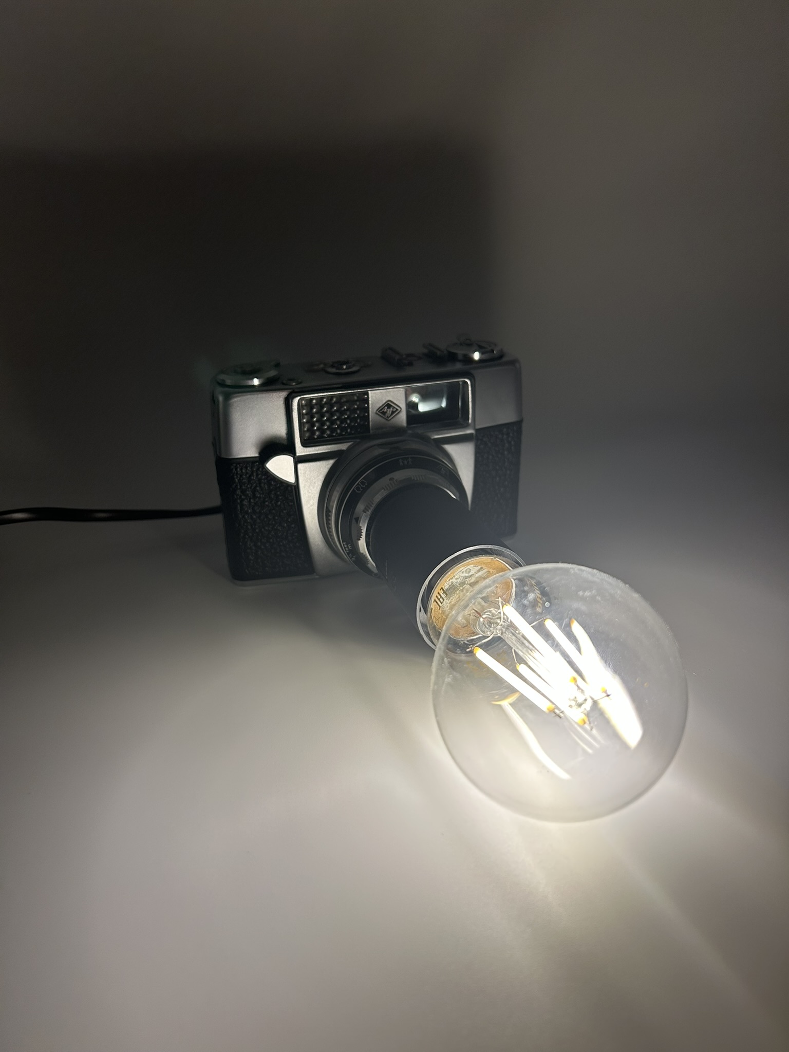 Ce modèle rétro est revisité pour accueillir une douille E27 intégrée avec soin, permettant d’y installer une ampoule décorative E27. Lorsque la lampe s’allume, la lumière semble émerger du cœur même de l’appareil, comme si le AGFA capturait désormais des éclats lumineux plutôt que des images. Ce jeu visuel offre un rendu à la fois esthétique, industriel et résolument moderne.