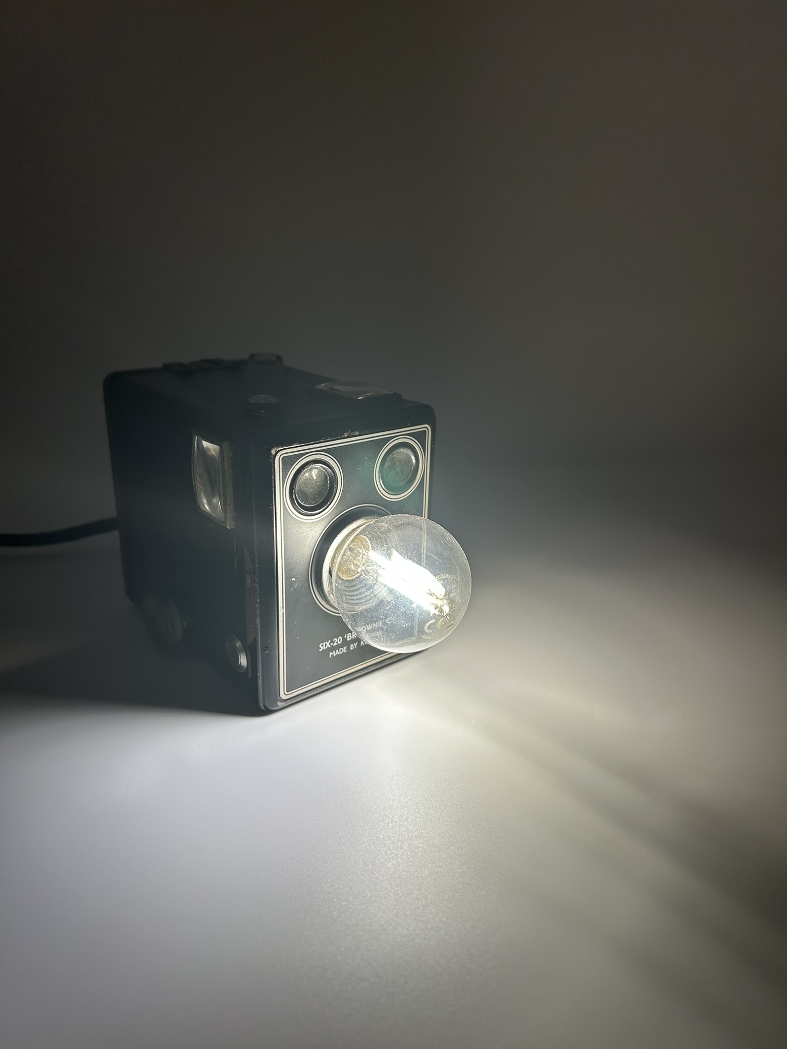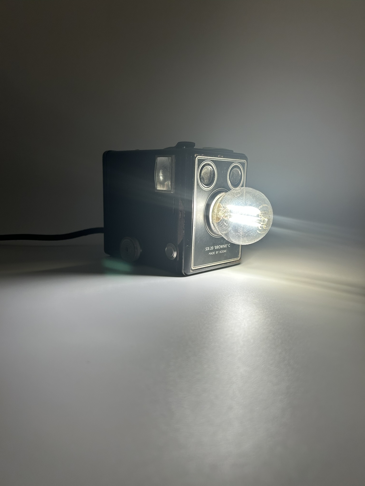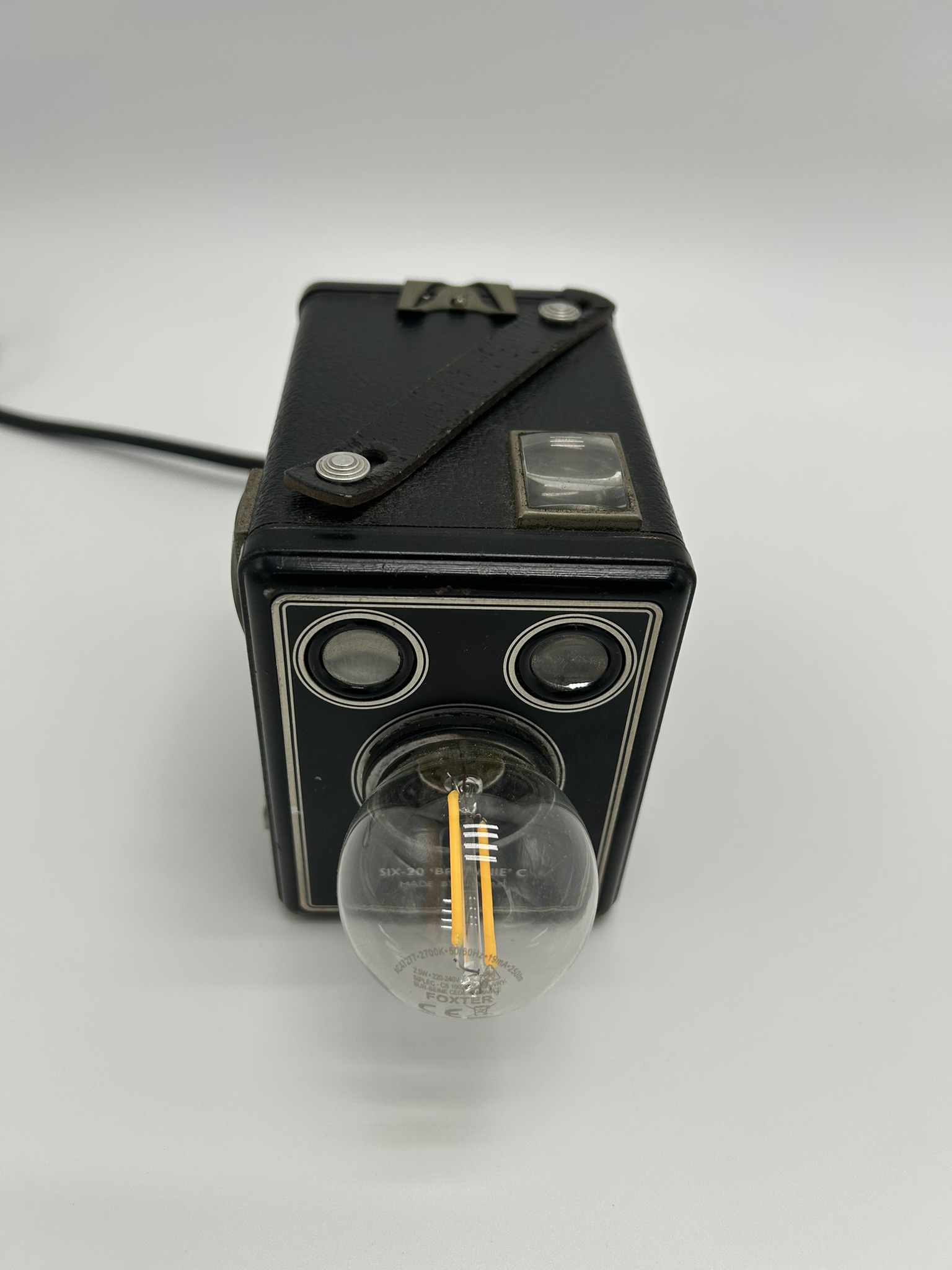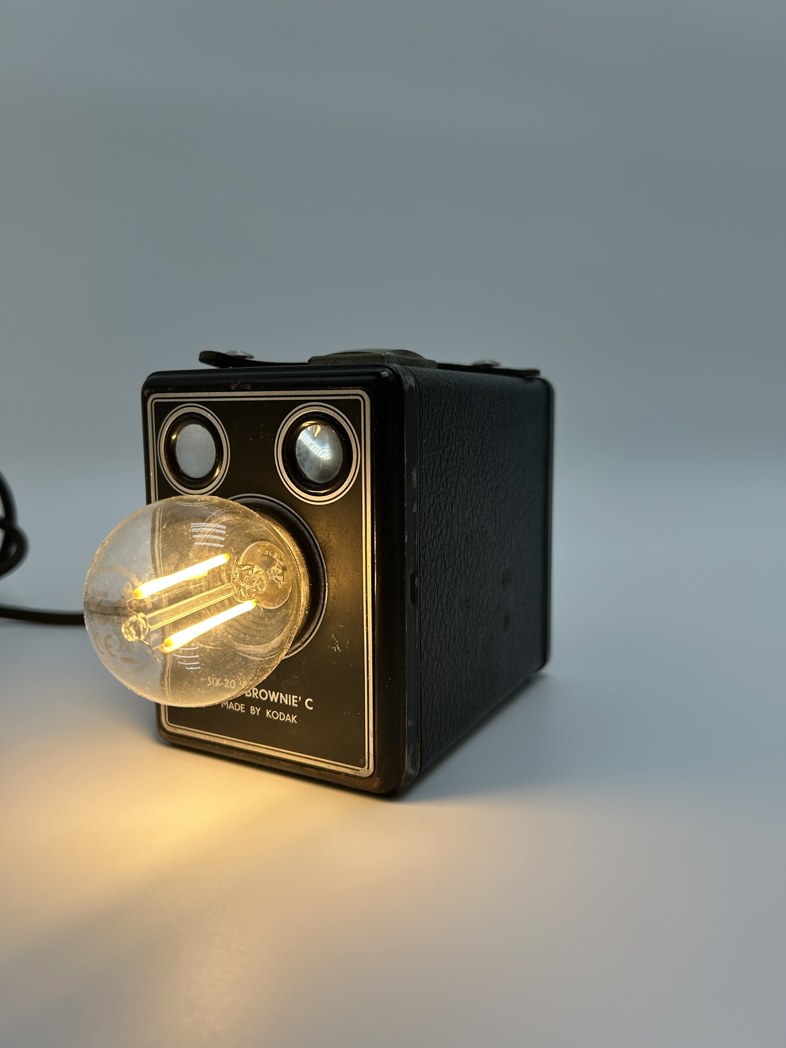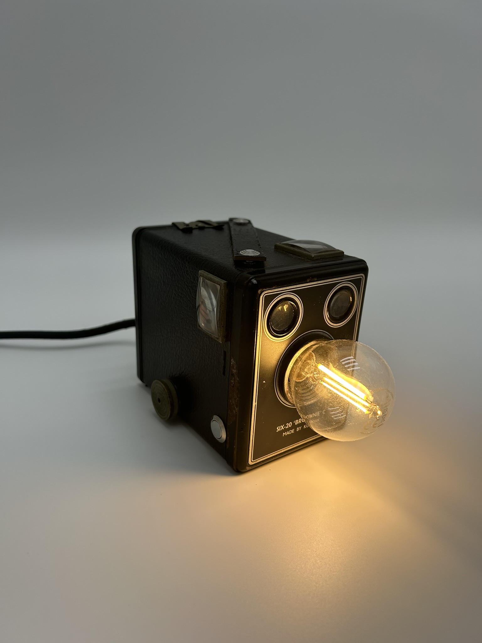 Plongez dans l’univers du vintage et du design artisanal avec cette création unique signée ILLUMINAC : un authentique appareil photo BROWNIE transformé en luminaire décoratif. Ce modèle iconique de l’histoire de la photographie est réinterprété pour devenir une pièce lumineuse originale, alliant charme rétro et élégance contemporaine.
