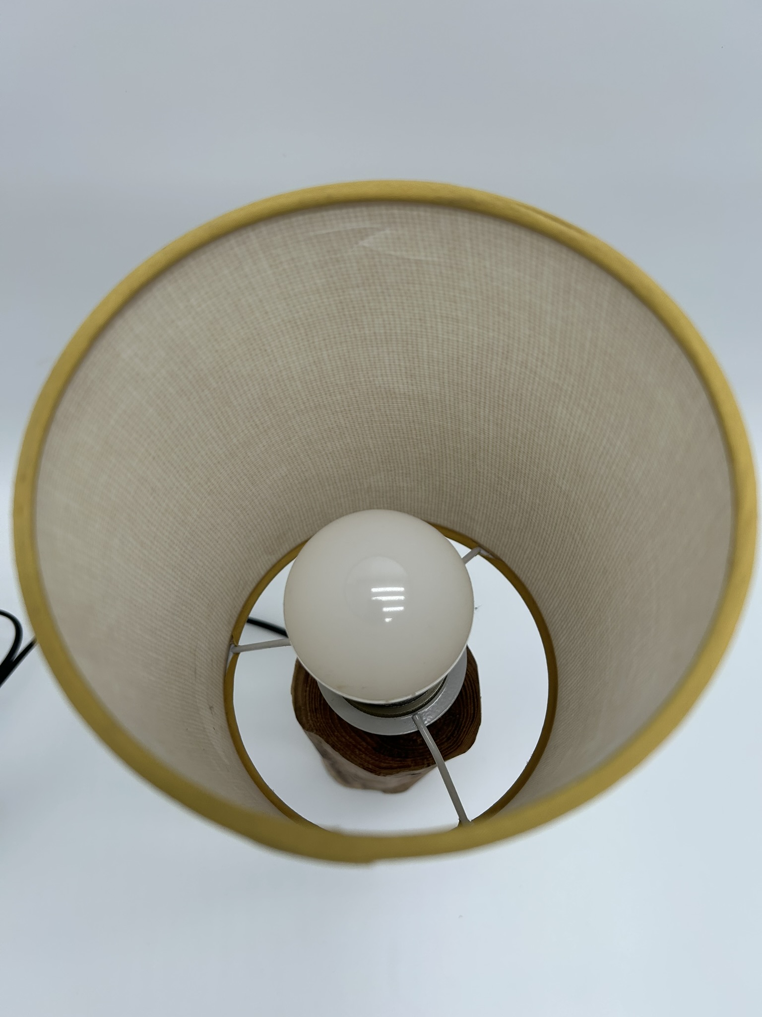L’ensemble est surmonté d’un abat-jour crème soigneusement sélectionné pour offrir une lumière tamisée, parfaite pour créer une ambiance cosy et relaxante dans une chambre ou un salon. Le contraste entre la texture brute du bois et la douceur du tissu crème crée un équilibre visuel harmonieux et raffiné.