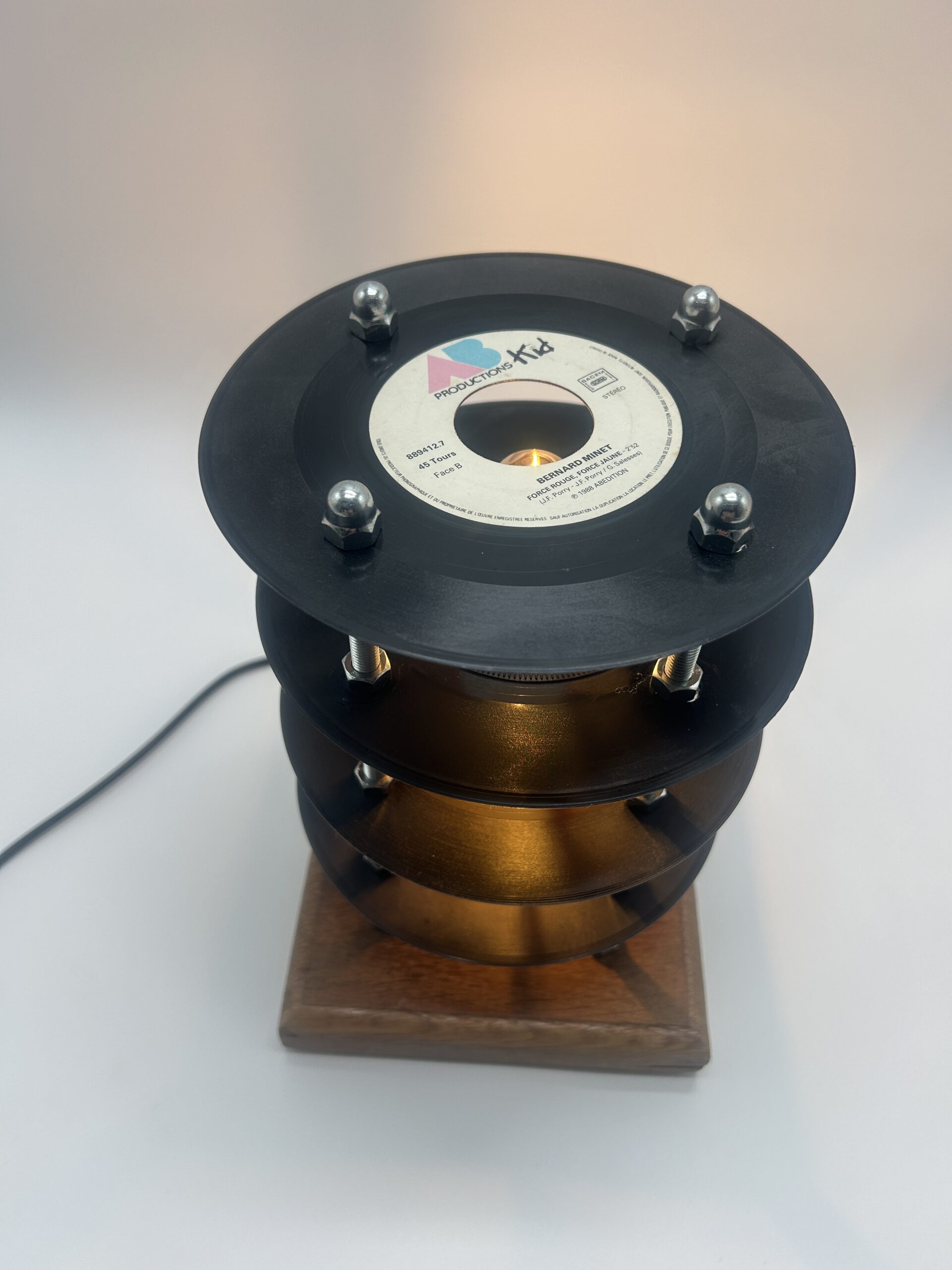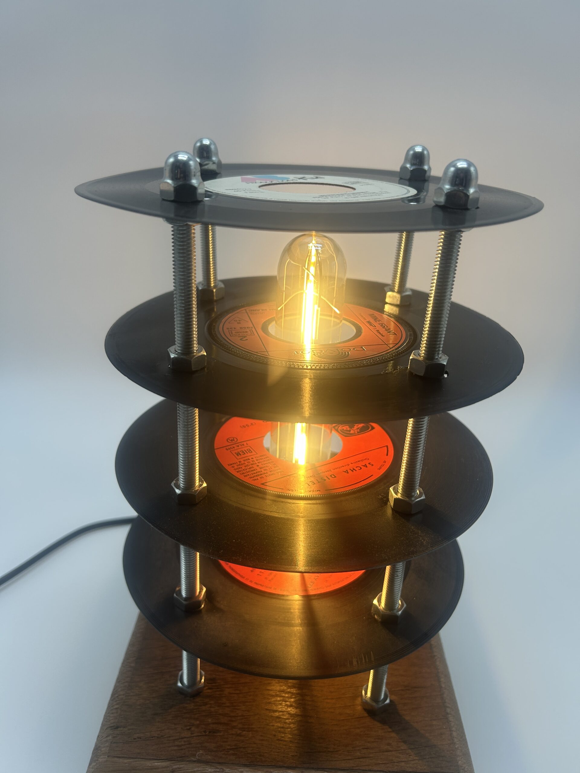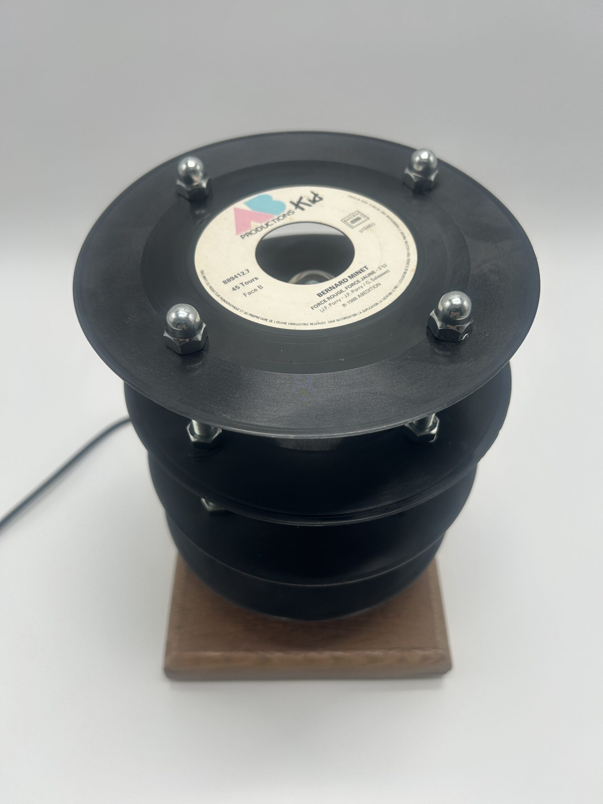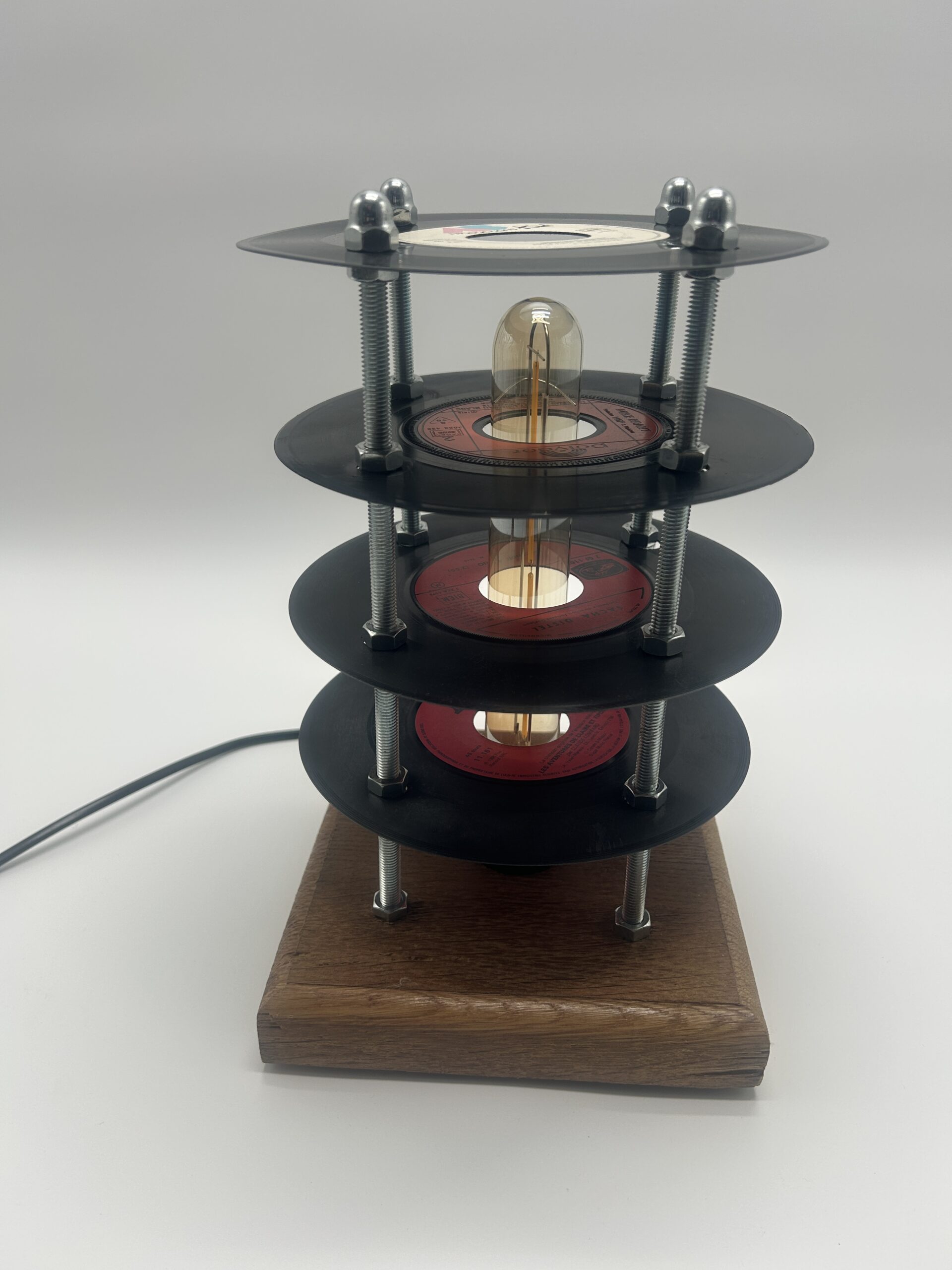 Affirmez le style de votre intérieur avec cette lampe fabriquée à partir de plusieurs vinyles 45 tours, une création originale qui détourne l’univers de la musique pour en faire un luminaire décoratif unique. Pensée comme une véritable pièce de caractère, cette lampe séduit immédiatement par sa composition visuelle atypique : les vinyles sont superposés et espacés de manière à former une petite tour graphique, légère et pleine de personnalité.