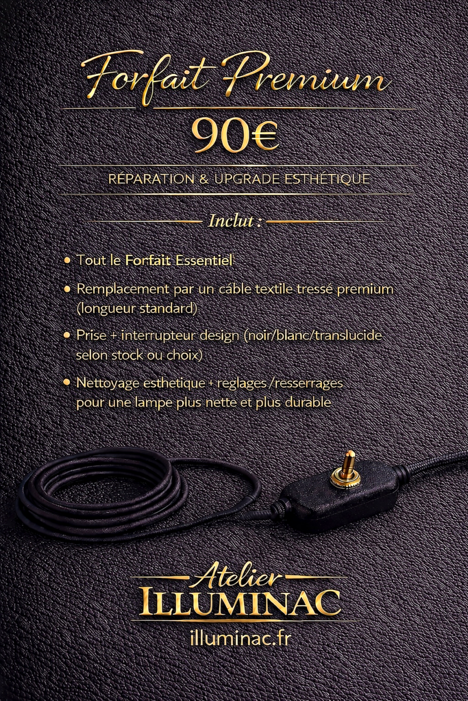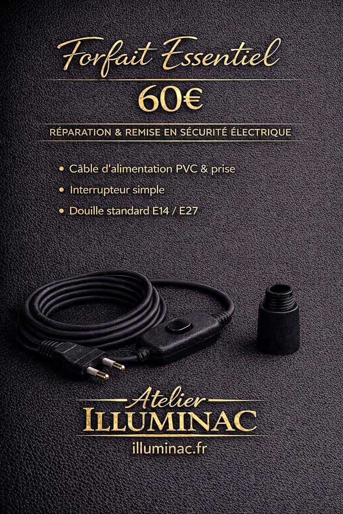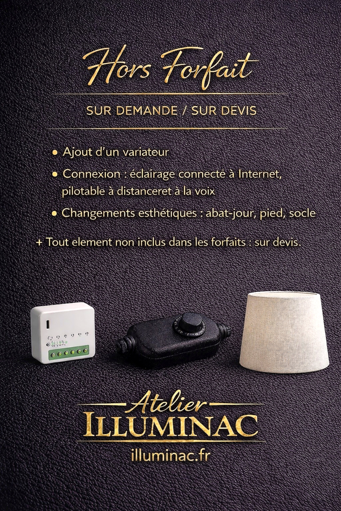 Parce que certains luminaires méritent une attention entièrement sur mesure, cette formule comprend la remise en état électrique de base, enrichie de personnalisations selon vos besoins : ajout d’un variateur, changement d’abat-jour, installation d’une douille haut de gamme ou encore adaptation du luminaire pour une connexion à un système connecté de type Google Home, Alexa, etc. Chaque projet est étudié avec soin afin de proposer une solution adaptée, uniquement sur devis.